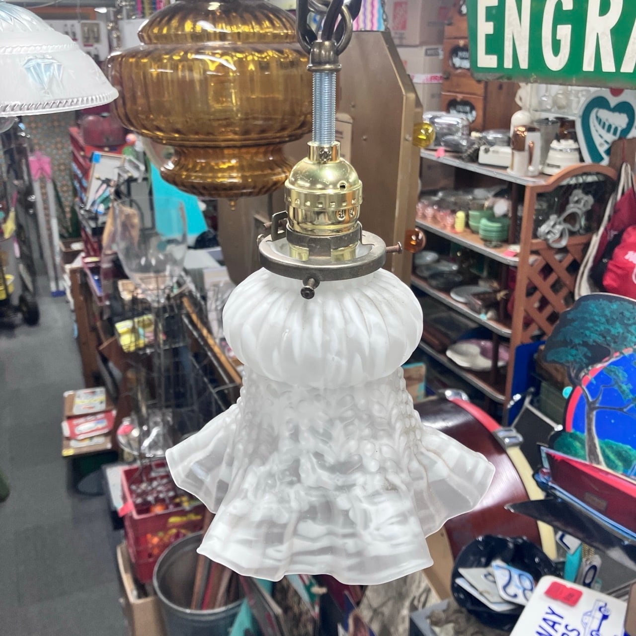 こちらは美しいフラワーガラスが特徴の「アンティーク フラワーガラス ペンダントランプ」です。優雅なデザインが目を引き、どんな空間にも華やかさをプラスします。