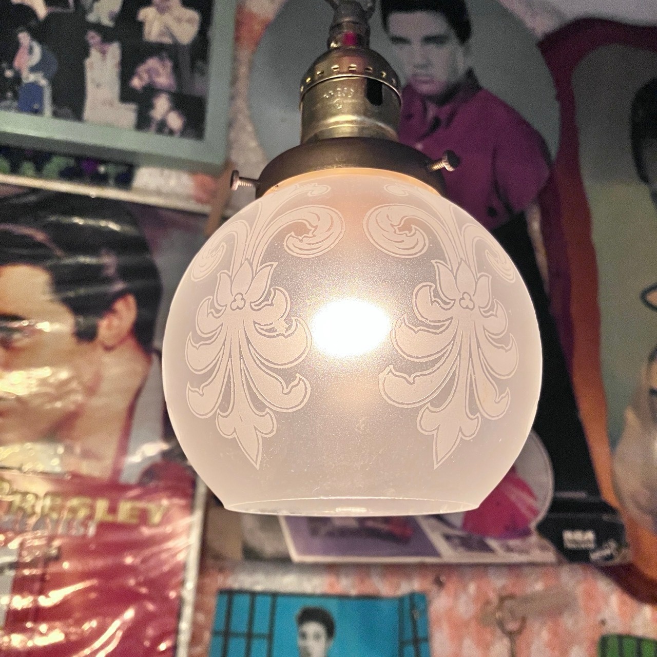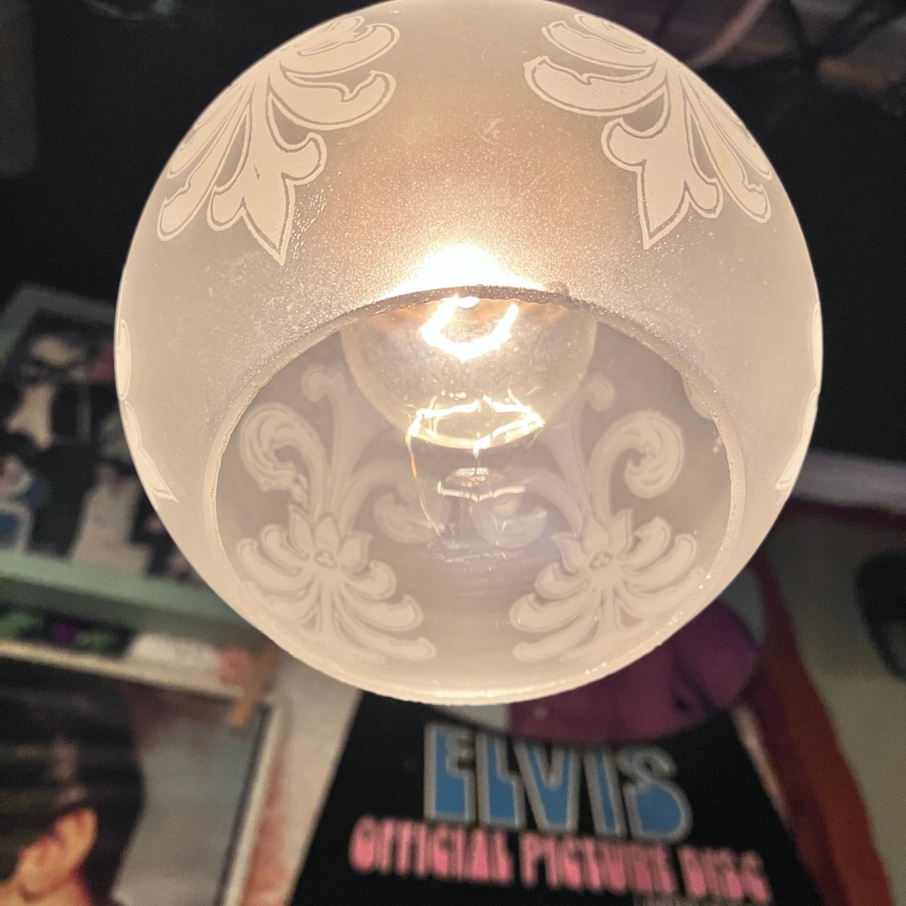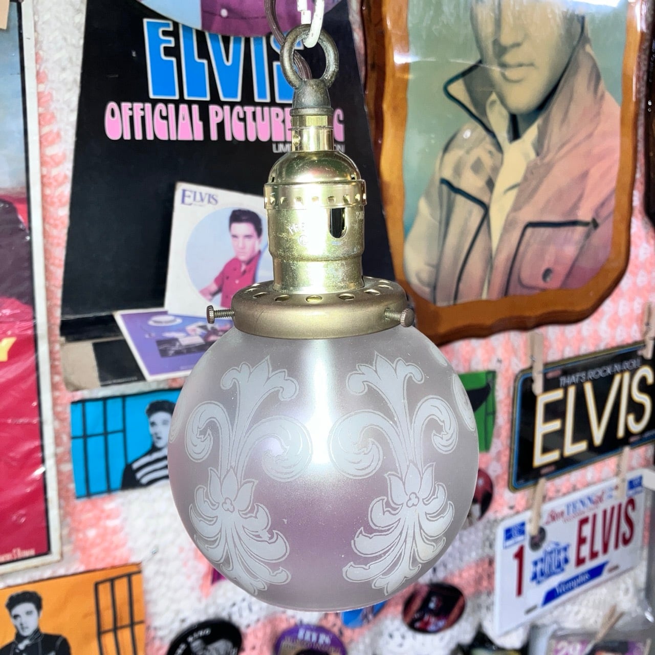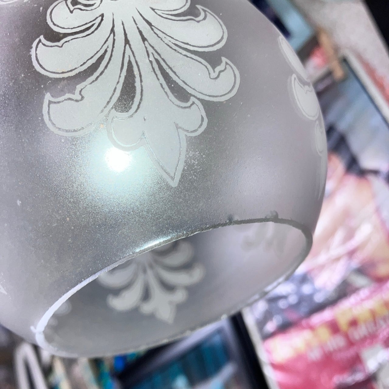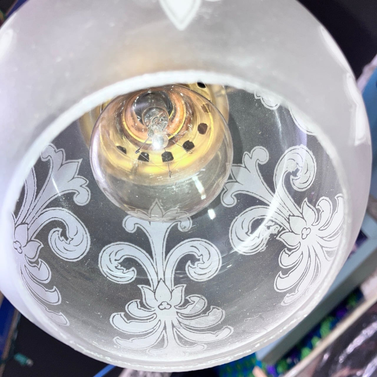 ころんと丸みのある形のガラスシェードには植物モチーフの躍動的な模様が入っており、繊細で優美な雰囲気が漂う、どの角度からも抜け目のない姿が楽しめます。
